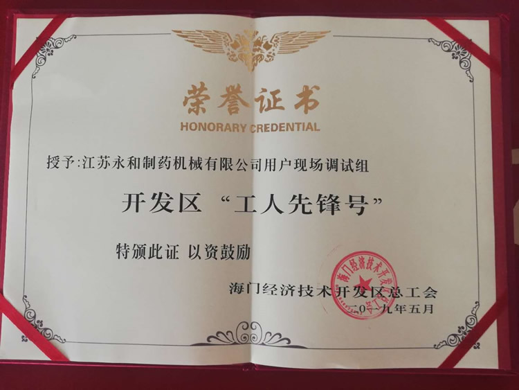 江蘇永(yǒng)和製藥機械用戶現場調試組喜獲(huò)“工人先鋒號”榮譽稱號