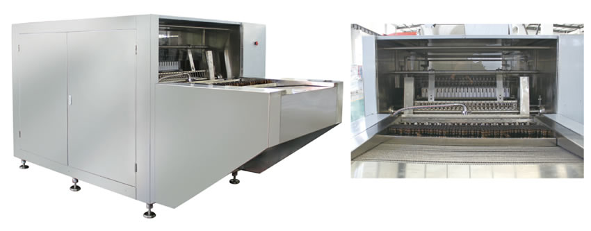 整機采用PLC控(kòng)製,人(rén)機界麵操作,具有手動、自動切(qiē)換功能。先經超聲波粗洗,後(hòu)由(yóu)特製瓶鬥載瓶,經十一道水氣(qì)工位(wèi)交替(tì)內外(wài)壓力衝洗,最(zuì)後經平移卸料機構出瓶,轉入(rù)下道工序。