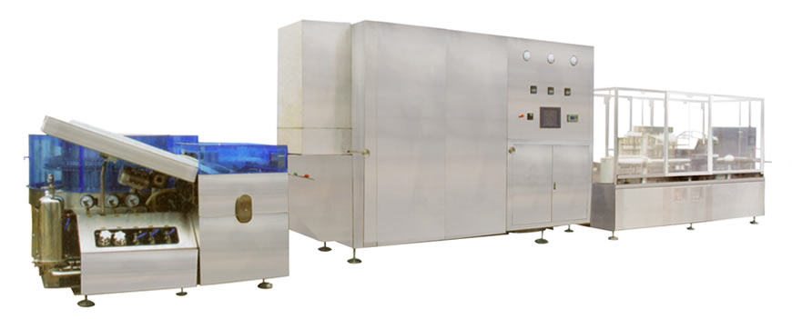 本機組符(fú)合“cGMP”要求,適用於安瓿的洗瓶、烘幹滅菌及灌裝封口,由QCL型立式超聲波清(qīng)洗機(jī)、MSH-B型熱風循環滅菌烘箱、AGF型自動安瓿灌封機組成聯動生(shēng)產線(xiàn)。