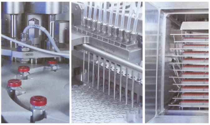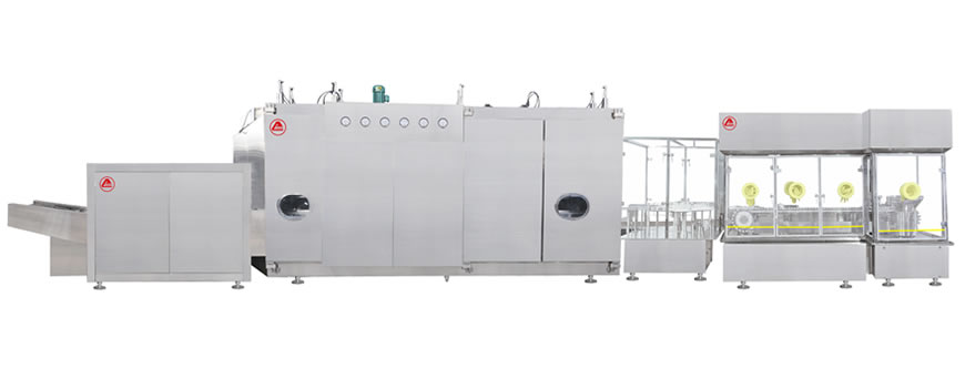 清(qīng)洗采(cǎi)用超聲波粗洗,先進(jìn)的特製(zhì)瓶鬥載瓶,模塊化清洗,十一道水氣交替衝洗(xǐ),機械式推(tuī)出瓶;幹燥滅菌采用熱風循(xún)環,獨(dú)有的熱膨脹(zhàng)連接,水冷循環冷(lěng)卻,烘箱網帶在線清洗;液體灌裝采用伺服電機控製(zhì)旋轉計量(liàng)泵灌裝,旋轉跟蹤壓塞,手套式隔離器操作,加塞無菌對(duì)接。