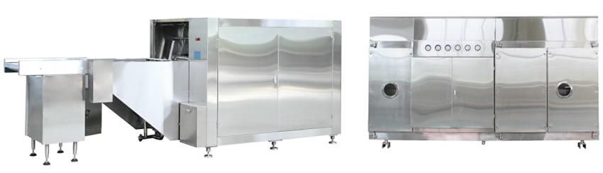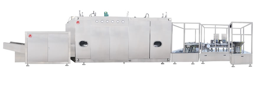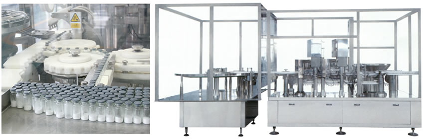 本機(jī)組符合“cGMP”要求,適用於西林瓶的洗瓶、烘幹滅(miè)菌及粉劑分裝,由CLQ-C型鏈式超聲波清洗機、KSM型玻璃瓶隧道式滅菌幹燥機、FJZ-400型高速粉劑螺杆分裝機組成聯動(dòng)生產線。